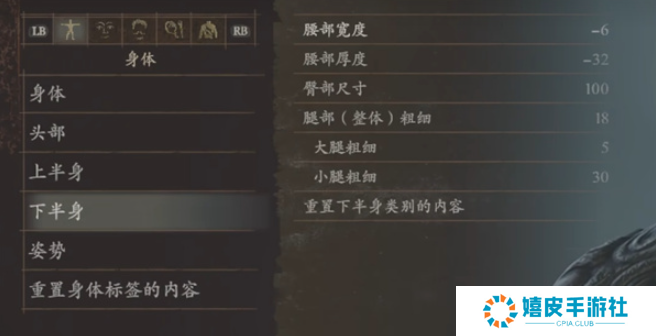 4、下半身:腰部宽度-6、腰部厚度-32、臀部尺寸100、腿部(整体)粗细18、大腿粗细5、小腿粗细30