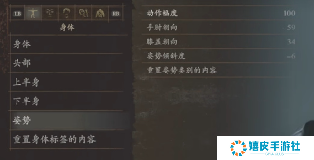 5、姿势:动作幅度100、手肘朝向59、膝盖朝向34、姿势倾斜度-6