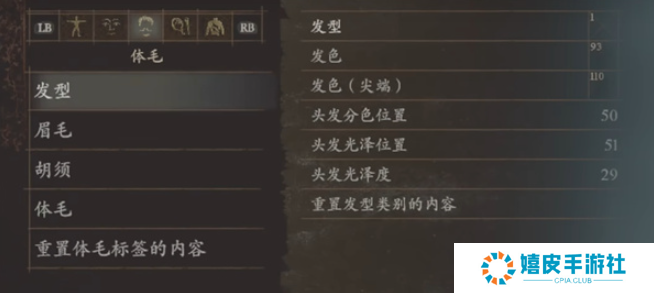 1、发型:发型1、发色93、发色(尖端)110、头发分色位置50、头发光泽位置51、头发光泽度29