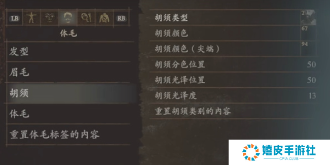 3、胡须:胡须类型7、胡须颜色67、胡须颜色(尖端)94、胡须分色位置50、胡须光泽位置50、胡须光泽度13