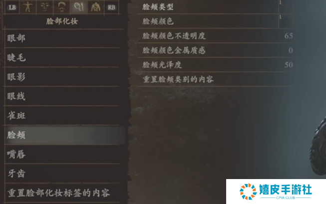 6、脸颊:脸颊类型1、脸颊颜色1、脸颊颜色不透明度65、脸颊颜色金属质感0、脸颊光泽度50