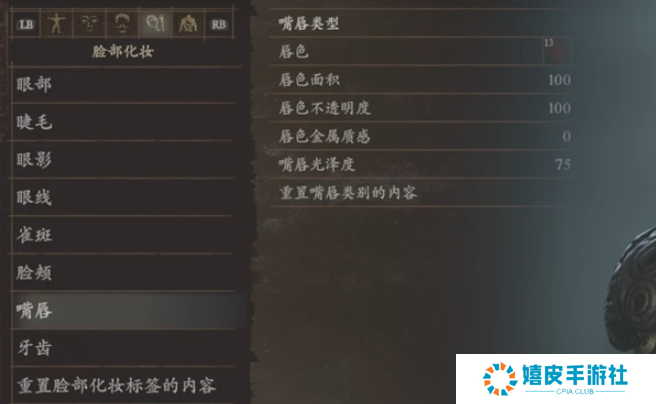 7、嘴唇:唇色13、唇色面积100、唇色不透明度100、唇色金属质感0、嘴唇光泽度75