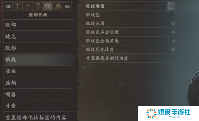 4、眼线:眼线色1、眼线范围57、眼线色不透明度41、眼线色金属质感0、眼线色光泽度40、眼线类型5