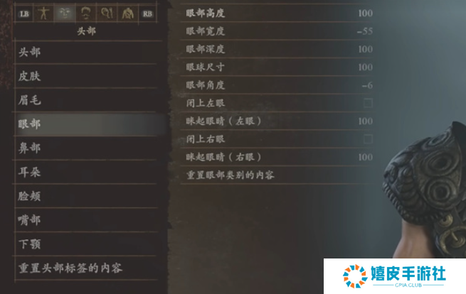 4、眼部:眼部高度100、眼部宽度-55、眼部深度100、眼球尺寸100、眼部角度-6、闭上左眼、眯起眼睛(左眼)100、闭上右眼、眯起眼睛(右眼)100