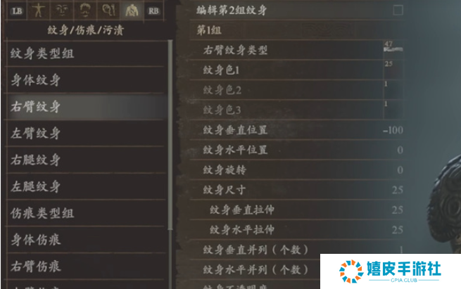 2、右臂纹身:身体纹身类型47、纹身色25、纹身垂直位置-100、纹身水平位置0、纹身旋转0、纹身尺寸25、纹身垂直拉伸25、纹身水平拉伸25、纹身垂直并列(个数)1、纹身水平并列(个数)1、纹身不透明度100