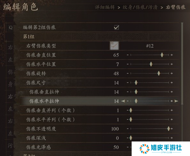 2、右臂伤痕:右臂伤痕类型12、伤痕垂直位置65、伤痕水平位置7、伤痕旋转48、伤痕尺寸14、伤痕垂直拉伸14、伤痕水平拉伸14、伤痕垂直并列(个数)1、伤痕水平并列(个数)1、伤痕不透明度100、伤痕深浅0、伤痕光泽感50
