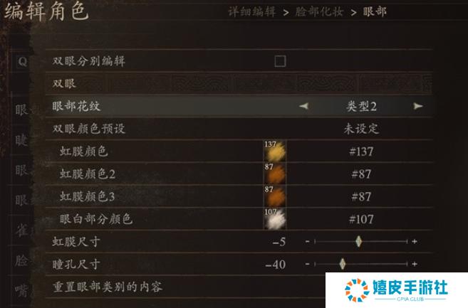 1、眼部:虹膜颜色137、虹膜顏色87 、虹膜颜色87、眼白部分颜色107 、虹膜尺寸-5、瞳孔尺寸-40、眼部花纹2