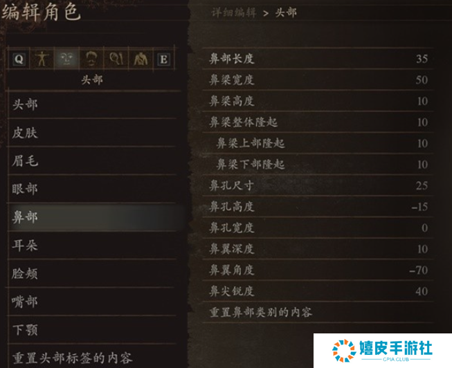 5、鼻部:鼻部长度35、鼻梁寬度50、鼻梁高度10、鼻梁整体隆起10、鼻梁上部隆起10、鼻梁下部隆起10、鼻孔尺寸25、鼻孔高度-15、鼻孔宽度0、鼻翼深度10、鼻翼角度-70、鼻尖锐度40