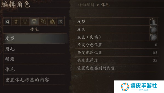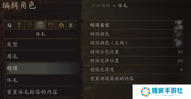 3、胡须:胡须类型2、胡须颜色11、胡须颜色(尖端)13、胡须分色位置80、胡须光泽位置60、胡须光泽度8