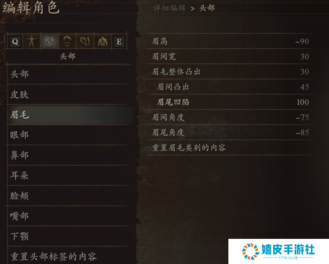 3、眉毛:眉高一90、眉间宽30、眉毛整体凸出30、眉间凸出45、眉尾凹陷100、眉间角度-75、眉尾角度-85