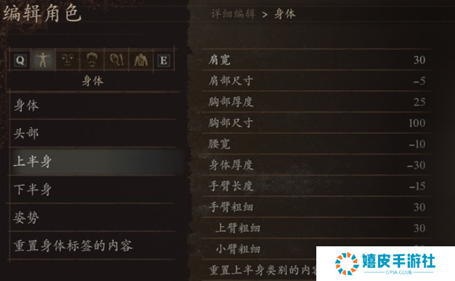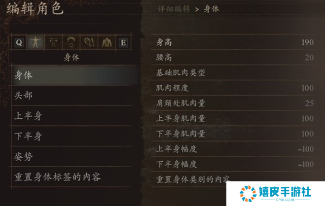 1、身体:身高190、腰高20、肌肉程度100、肩頸处肌肉量25、上半身肌肉量100、下半身肌肉量100、上半身幅度-100、下半身幅度-100