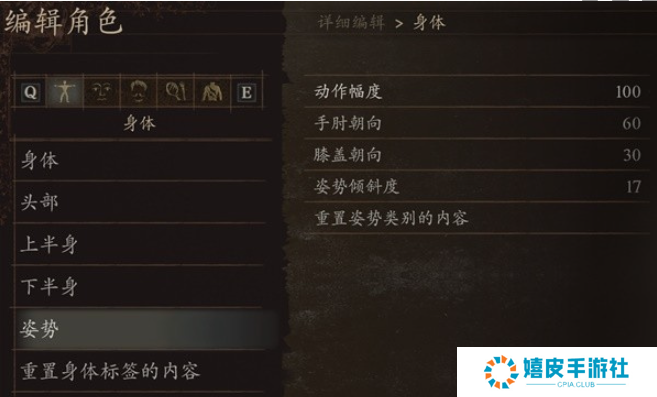 5、姿势:动作幅度100、手肘朝向60、膝盖朝向30、姿势倾斜度17
