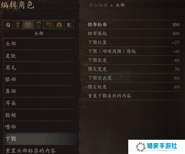 9、下颚:腮帮轮廓100、腮帮隆起100、下颚位置-25、下颚(咽喉周围)隆起-10、下预长度40、颚尖宽度30、下预突出度60、颚尖锐度69