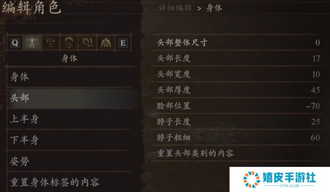 2、头部:头部整体尺寸0、头部长度17、头部宽度10、头部厚度45、脸部住置-70、脖子长度25、脖子粗细60