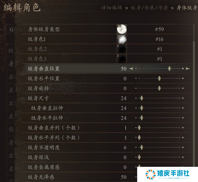 1、身体纹身:身体纹身类型59、纹身色16、纹身垂直位置50、纹身水平位置0、纹身旋转0、纹身尺寸24、纹身垂直拉伸24、纹身水平拉伸24、纹身垂直并列(个数)1、纹身水平并列(个数)1、纹身不透明度6、纹身深浅0、纹身光泽感50