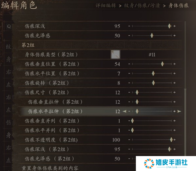 4、身体伤痕:身体伤痕类型5、伤痕垂直位置60、伤痕水平位置-8、伤痕旋转-20、伤痕尺寸3、伤痕垂直拉伸3、伤痕水平拉伸2、伤痕垂直并列(个数)1、伤痕水平并列(个数)1、伤痕不透明度100、伤痕深浅95、伤痕光泽感50