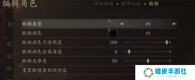 6、脸颊:脸颊类型1、脸颊颜色1、脸颊颜色不透明度100、脸颊颜色金属质感0、脸颊光泽度50
