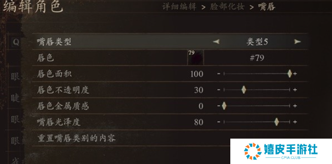 7、嘴唇:唇色79、唇色面积100、唇色不透明度30、唇色金属质感0、嘴唇光泽度80、嘴唇类型5