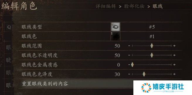 4、眼线:眼线色1、眼线范围50、眼线色不透明度50、眼线色金属质感0、眼线色光泽度30、眼线类型5