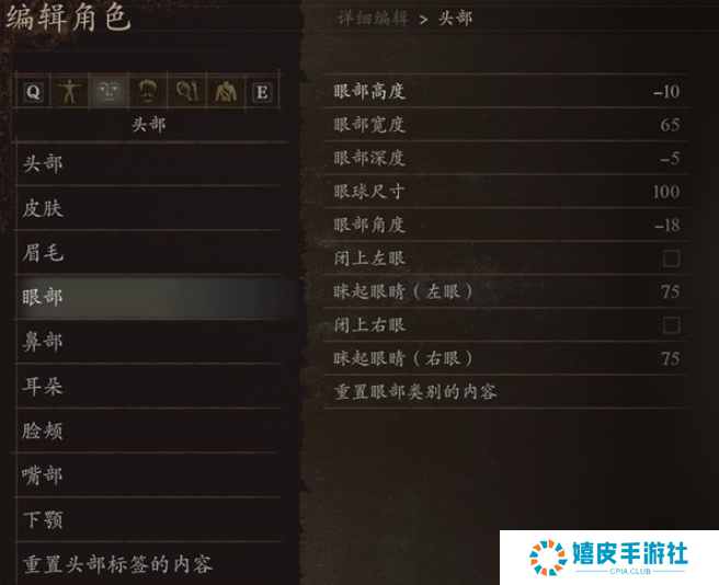 4、眼部:眼部高度-10、眼部宽度65、眼部深度-5、眼球尺寸100、眼部角度-18、闭上左眼、眯起眼睛(左眼)75、闭上右眼、眯起眼睛(右眼)75