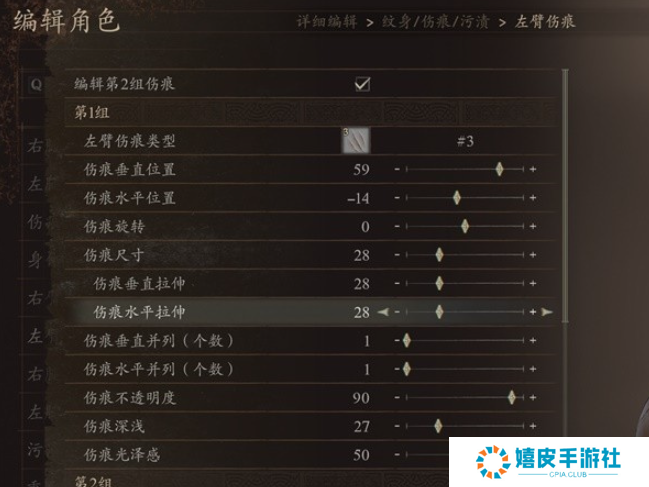 3、左臂伤痕:左臂伤痕类型3、伤痕垂直位置59、伤痕水平位置-14、伤痕旋转0、伤痕尺寸28、伤痕垂直拉伸28、伤痕水平拉伸28、伤痕垂直并列(个数)1、伤痕水平并列(个数)1、伤痕不透明度90、伤痕深浅27、伤痕光泽感50