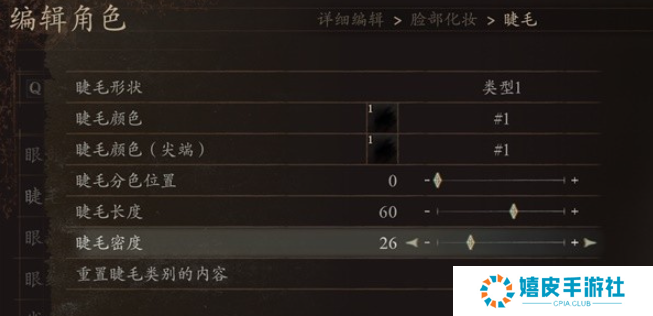 2、睫毛:睫毛颜色1、睫毛颜色(尖端)1、睫毛分色位置0、睫毛长度60、睫毛密度26、睫毛形状1