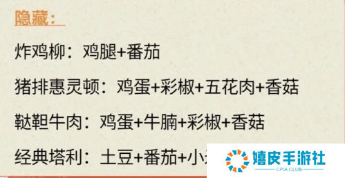 隐藏菜谱 炸鸡柳=鸡腿+番茄 猪排惠灵顿=鸡蛋+彩椒+五花肉+香菇 鞑靼牛肉=鸡蛋+牛腩+彩椒+香菇 经典塔利=土豆+番茄+小米椒+黄瓜