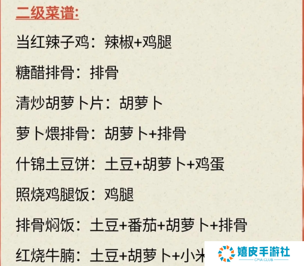 二级菜谱 当红辣子鸡=辣椒+鸡腿 糖醋排骨=排骨 清炒胡萝卜片=胡萝卜 萝卜煨排骨=胡萝卜+排骨 什锦土豆饼=土豆+胡萝卜+鸡蛋 照烧鸡腿饭=鸡腿 排骨焖饭=土豆+番茄+胡萝卜+排骨 红烧牛腩=土豆+胡萝卜+小米辣+牛腩