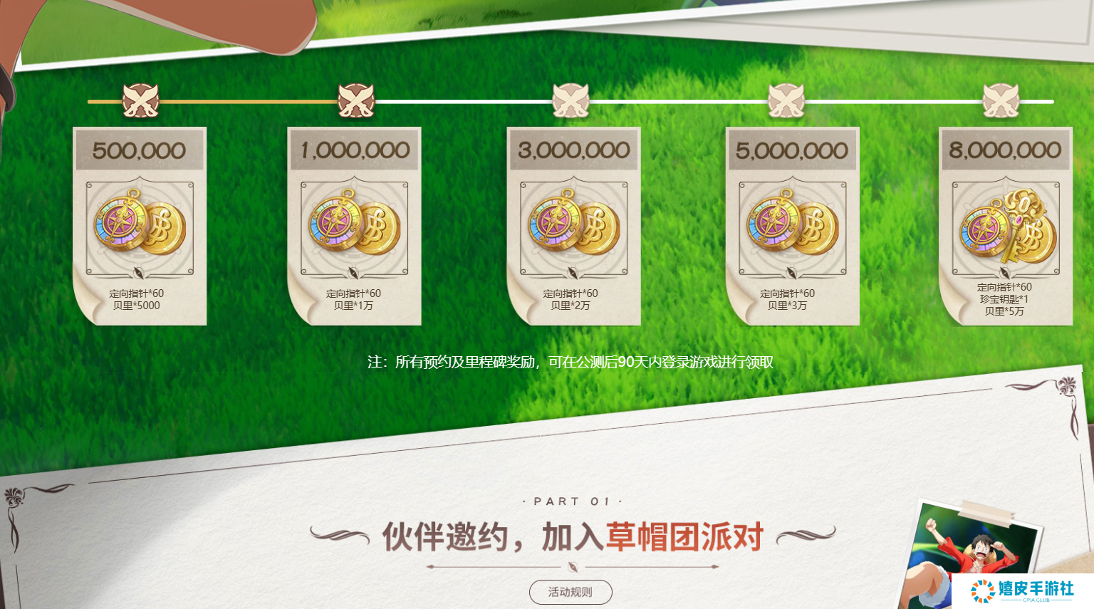 2、【100万预约】:梦想指针*30、贝里*1万。