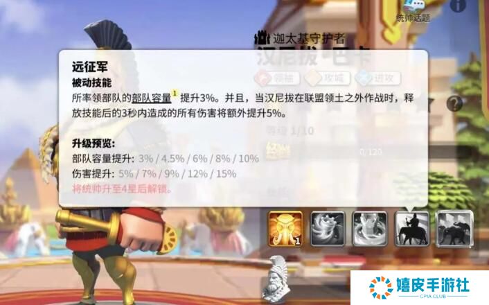 主动技能:远征军 让部队的容量提升10%,当在外战斗时可以增加15%的技能伤害。