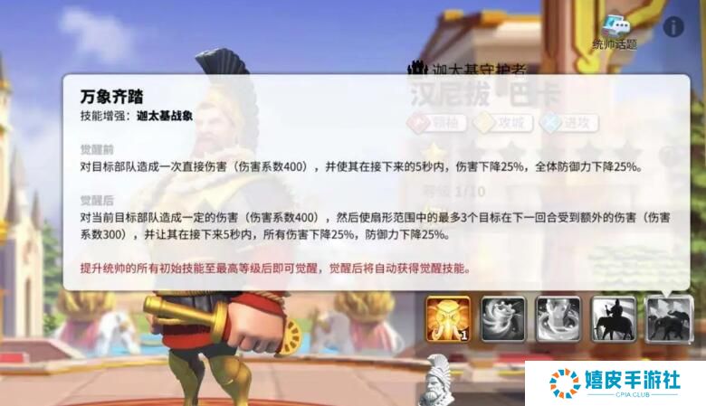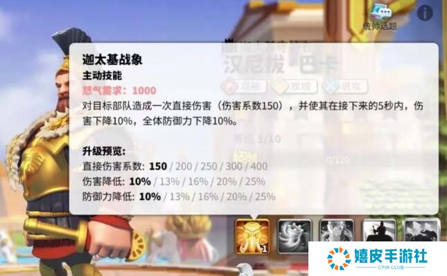 在万国觉醒游戏中,有很多玩家不清楚汉尼拔的主动技能名称是什么,这个角色的主动技能为迦太基战象,可以对敌方单体造成伤害,同时5秒内减少25%的伤害和防御,下面就和小编一起来看看万国觉醒汉尼拔主动技能介绍吧。