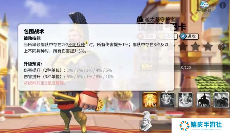 主动技能:包围战术 有2种不同的单位时,获得5%的全体伤害加成,有3种不同的单位时,获得10%的全体伤害加成。