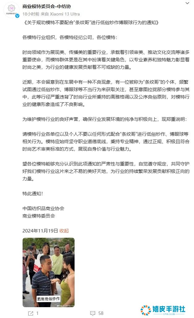 然而也正是这种怪异且富有冒犯的举动,竟然给他带来了很高的人气和流量,追捧者有之,赞其特立独行,不顾世俗目光;批评者更甚,称其恶臭无聊,用这种诡异的方式博人眼球。 但有争议才有话题,才会又流量,“条纹哥”更加火爆,在直播时,竟然真的有越来越多的职业模特涌入直播间与其互动,看起来一切形势大好,马上就能带货的时候,中国纺织品商业协会下属商业模特委员会发声了。 日前,该委员会发布通知,规劝模特不要配合“条纹哥”进行低俗炒作博眼球的行为,其中提到: 近期,本会留意到在车展中有一种不良现象,有一位被称为“条纹哥”的个体,频繁试图通过低俗炒作、博眼球等不当行为来获取关注,甚至意图拉拢部分模特参与其中,此等行径严重违背了时尚行业所秉持的高雅格调以及公序良俗原则,对模特行业的健康形象造成了不良影响。 请模特行业各单位以及个人不要以任何形式配合“条纹哥”进行低俗炒作、博眼球等相关行为。模特应始终坚守职业道德底线,秉持专业精神,通过正规、积极且符合时尚艺术审美标准的方式,展现自身价值与行业魅力。