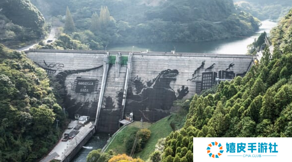 位于日本佐贺县的一座岩屋川内水库大坝日前成了县内新打卡热点,原来这里的大坝侧面惊现哥斯拉大壁画,如果离近了你才会发现是人工打造的结果。