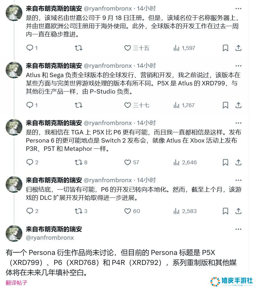 推主Ryan from the Bronx(前化名是Midori)近日发推,他表示《女神异闻录6》不会在今年12月12日举办的TGA大奖上公布,但倒是有可能会在任天堂Switch 2公布活动上亮相。传言称,这还要几个月的时间才能看到任天堂正式公布Switch 2。 他还表示《女神异闻录6》的开发已经进入本地化阶段,这意味着开发进度相当快,内容应该已经完成。 透露的另一个消息是,未来的“DLC扩展”开发已于本月开始。这也表明游戏不再处于内容阶段,而是处于完善阶段。