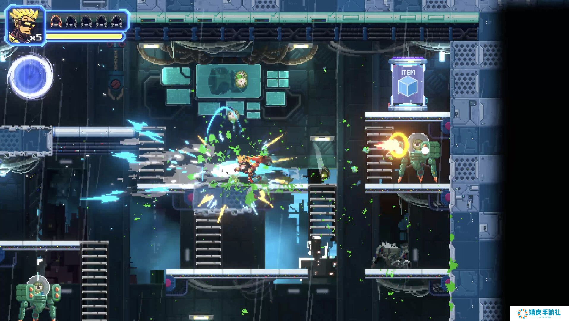 [游戏背景] 未来背景的横版卷轴移动枪战动作游戏。失去一切后作为半机械人重生的主人公凯文,开始向夺走他一切的外星人哥利达复仇。