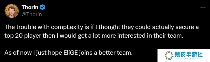 “Complexity的问题在于,如果我认为他们真的能获得一名Top20选手,那么我会对他们的阵容更感兴趣。 现在我只希望EliGE加盟一支更好的队伍。”