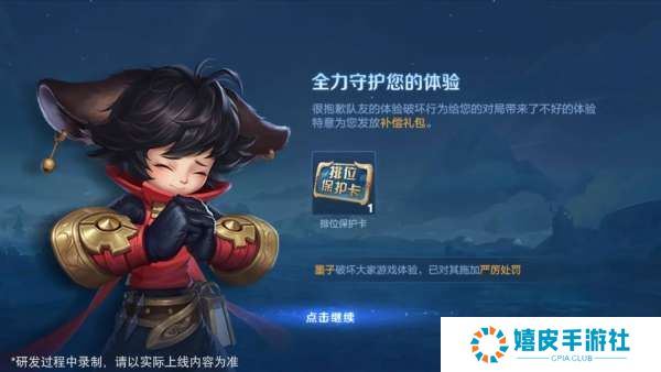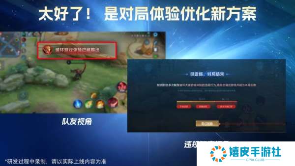 二、对局体验优化 新版本将会改善对局行为检测机制和举报系统,对部分玩家的明显摆烂行为进行更及时的处理。 首先是限制恶意玩家,当检测到多次触发破坏大家游戏体验的行为之后,将会被请出游戏对局并视为本局失败,并扣除更多的信誉分。 在队友视角中,会看到“破坏游戏体验已被踢出”的提醒,后续会被对应段位强度的AI接管。