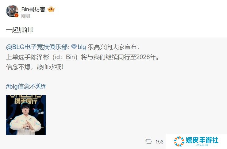 直播吧12月5日讯 今日BLG官方官宣与Bin选手续约,Bin转发续约公告,并配文:一起加油!