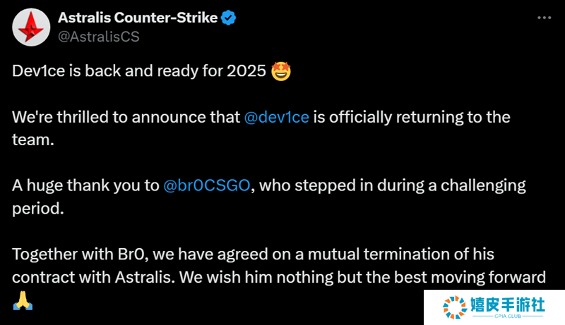 Astralis官网完整声明如下: 在我们为Astralis的下一章旅程做准备之际,我们非常高兴地宣布device正式回归战队。在花时间关注自己的身心健康之后,device现在已经完全准备好重回战队,并将他非凡的能力、知识和奉献精神带回赛场。 从2025年初开始,当队伍在假期结束后重新集结时,device将会重新开始行动——积极、专注并决心有所作为。我们迫不及待地想看到他重新穿上Astralis的队服,随时准备帮助战队前进。 谢谢你,br0 在我们兴奋展望未来的同时,俱乐部也要感谢br0的巨大贡献,他在Astralis特别具有挑战性的时期挺身而出。尽管准备时间有限,br0还是在RMR上迎难而上,为队伍奉献了自己的一切。 我们已与br0达成一致,双方同意终止他与Astralis的合约。我们非常感谢他在与我们合作期间所表现出的专业和奉献精神。很高兴他能成为Astralis大家庭的一员,我们衷心祝愿他今后一切顺利。 准备迎接2025 回顾过去,2024年并非我们最轻松写意的一年,但我们对未来充满信心。随着device的回归和重新聚焦前进,我们已经准备好以全新的能量和决心迎接2025年。 对于我们超棒的社区,感谢你们坚定不移的支持——我们将一起继续迈向星辰大海。 当前Astralis阵容如下: Casper Møller | cadiaN
