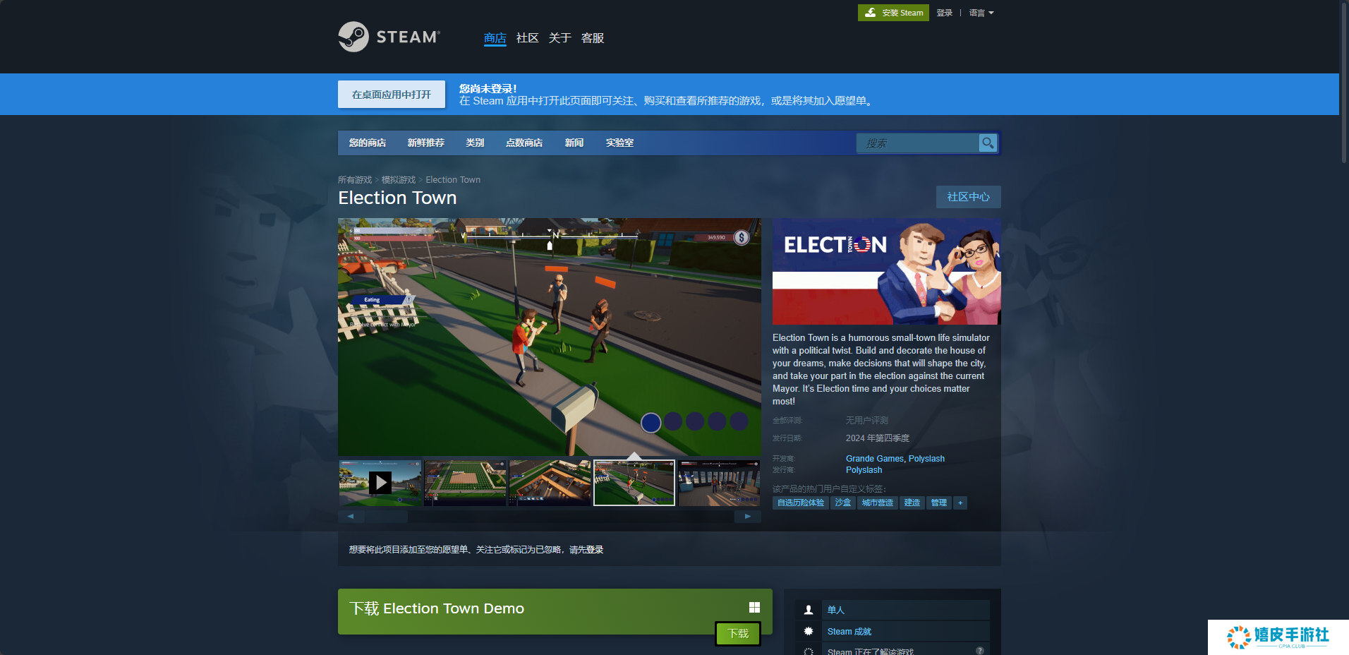 《选举小镇》是一款非常有趣的小镇生活模拟器游戏,而这款游戏想要下载还是比较麻烦的,下载的第一步就是安装Steam平台,然后注册账号登录,并且搜索“Election Town”,然后点击购买,之后点马上开玩即可。