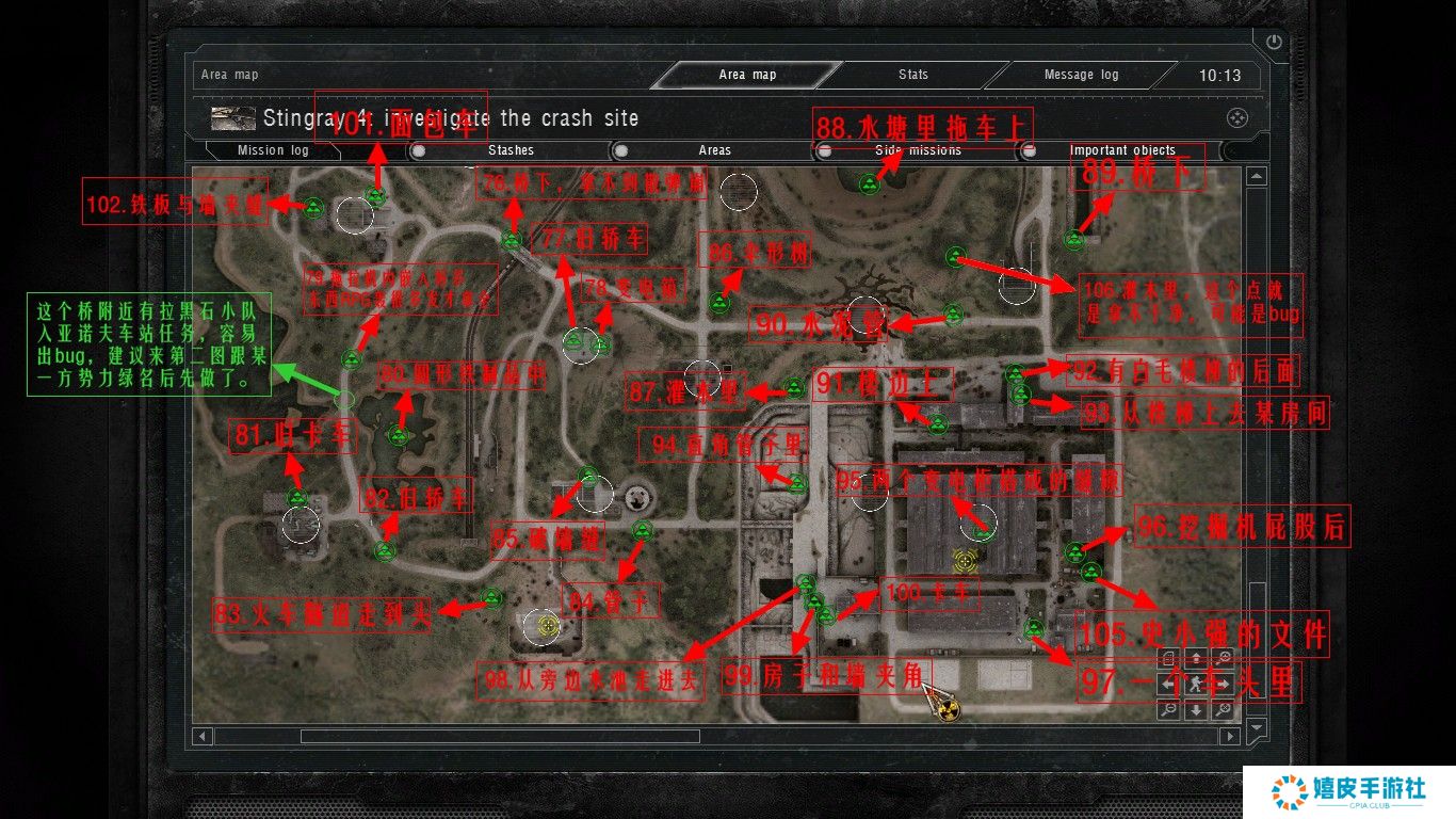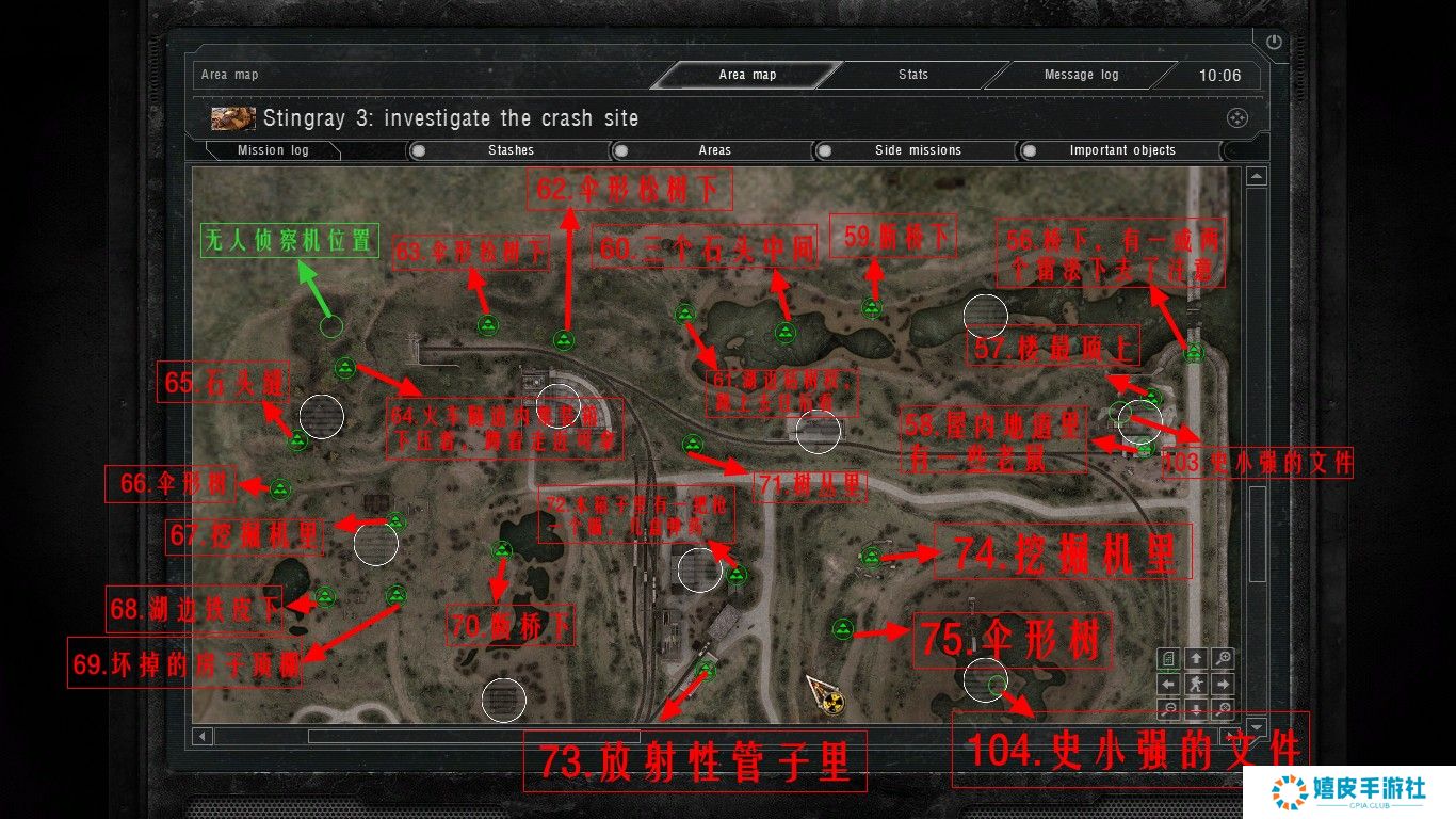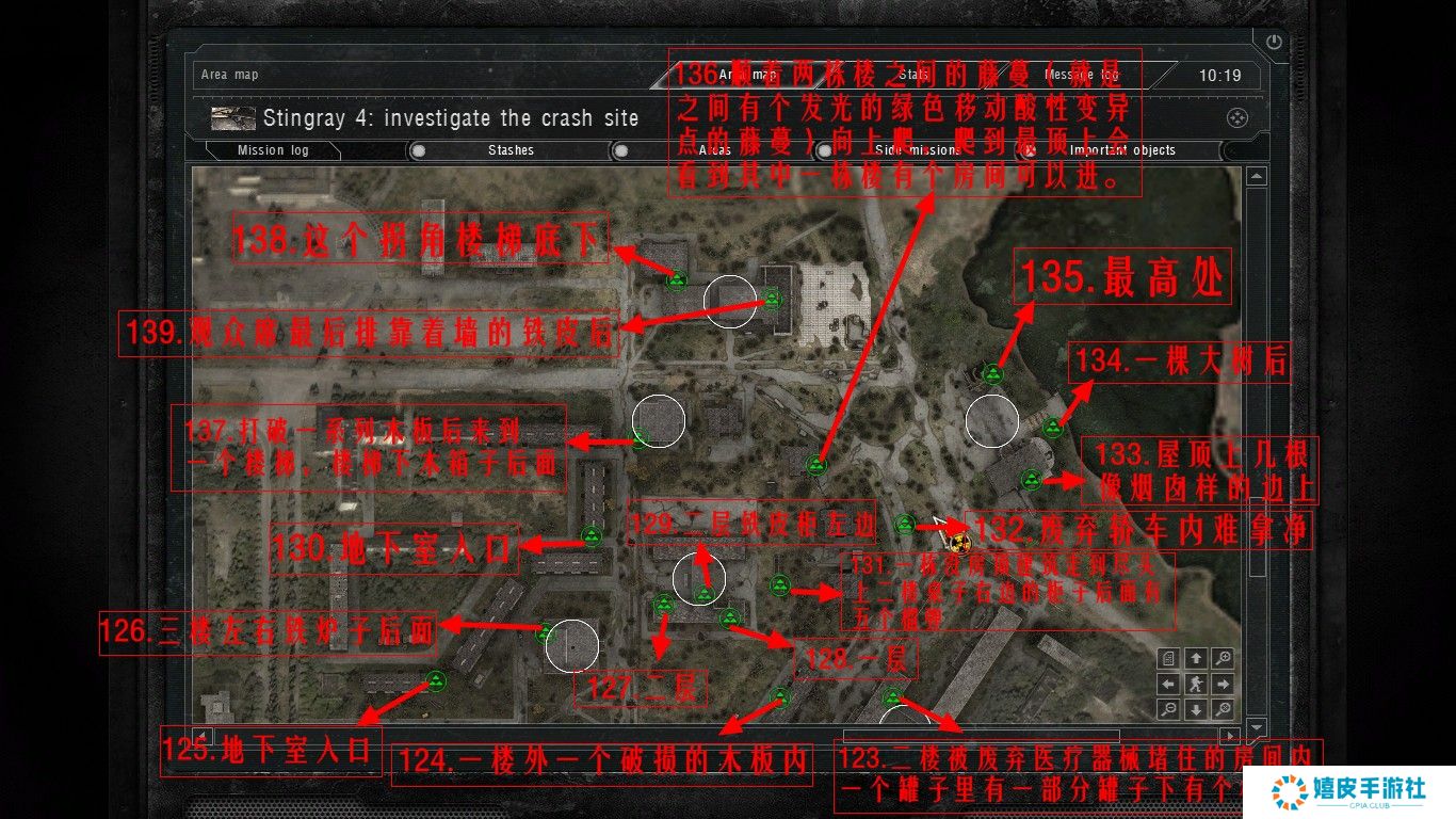 《潜行者:切尔诺贝利的阴影》中的隐藏点在游戏里藏的非常深的,基本上每个区域都有隐藏点存在,按照下图寻找即可,其实废船基地(家)西北的船头下面就有个跑路药,就放在水里。