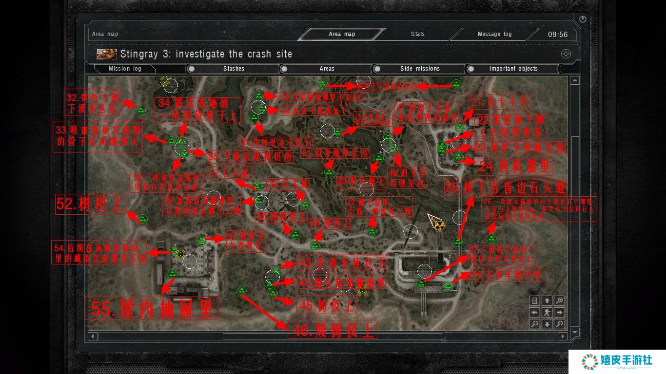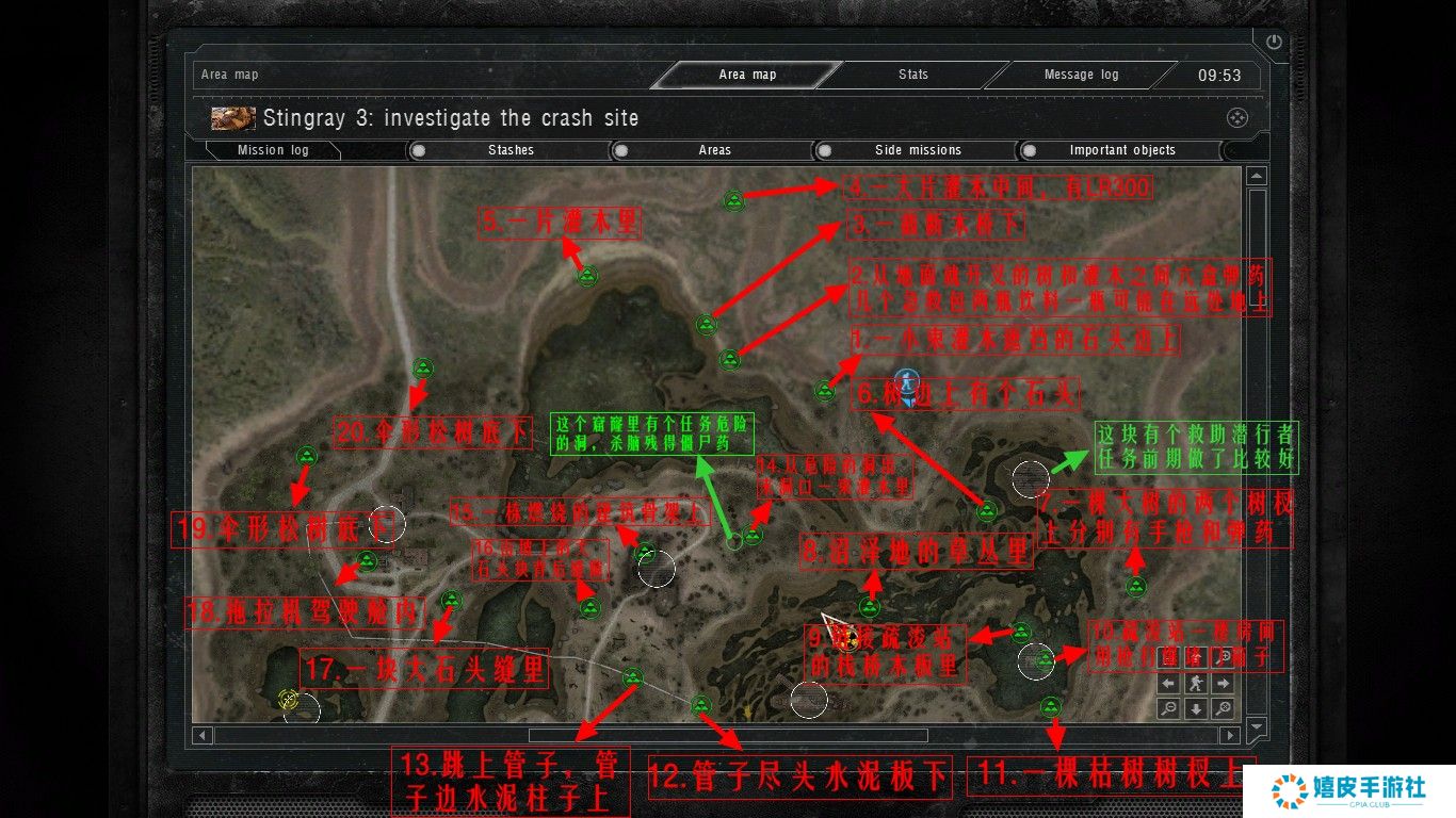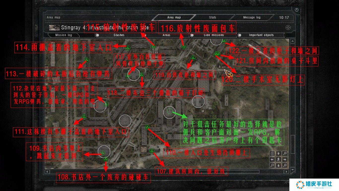 《潜行者:切尔诺贝利的阴影》中的隐藏点在游戏里藏的非常深的,基本上每个区域都有隐藏点存在,按照下图寻找即可,其实废船基地(家)西北的船头下面就有个跑路药,就放在水里。