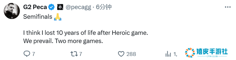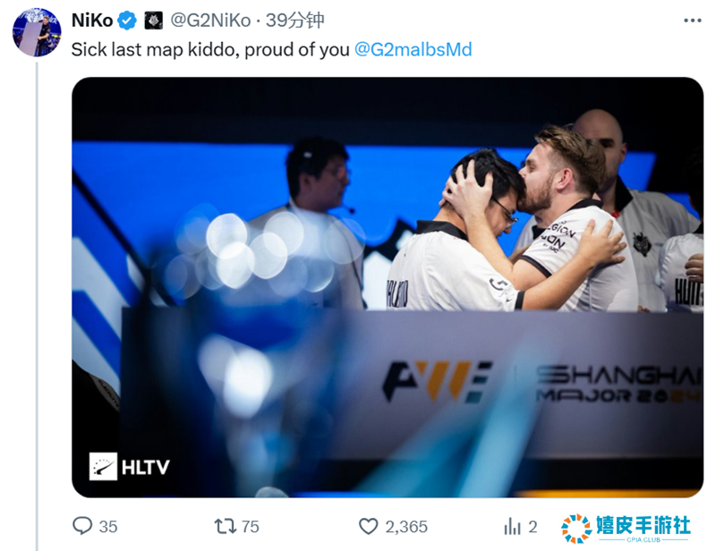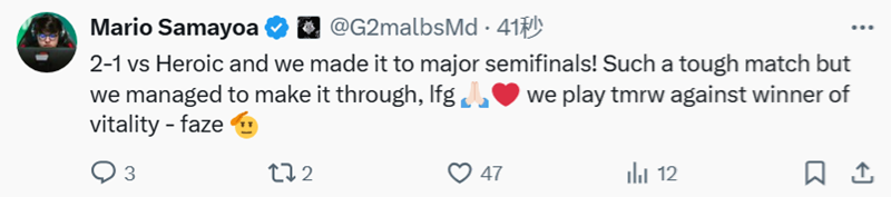 恭喜 G2挺进半决赛! 在刚刚结束的上海Major四分之一决赛中,G2战队以惊险的2-1比分击败 HEROIC晋级半决赛。一起看看选手们的赛后动态吧。  上海Major2024 G2   Heroic 6 Ancient 1313 Nuke 916 Mirage 13 G2:把它(HEROIC)放回应有的位置。