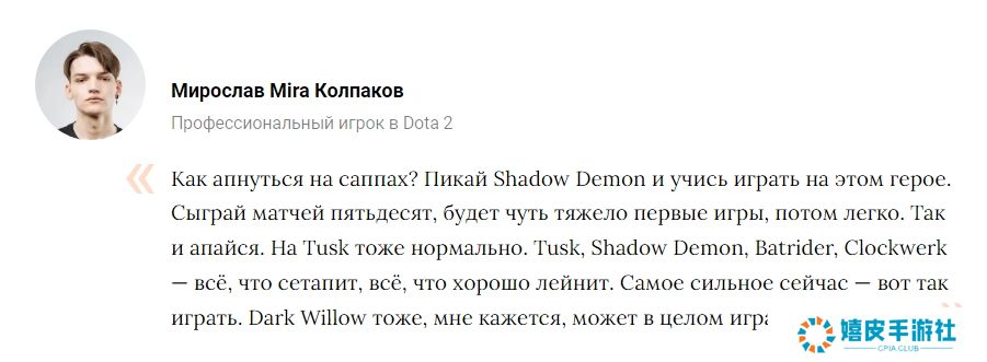 “如何提升你的天梯积分?选择暗影恶魔,学习如何玩这个英雄。打五十场比赛,前几场会有点难,然后就会很容易了。然后你就可以上手了。獠牙也不错。獠牙、暗影恶魔、蝙蝠骑士、发条--只要是能套路的,只要是能很好地套路的,都可以。现在最强的就是这样打。”