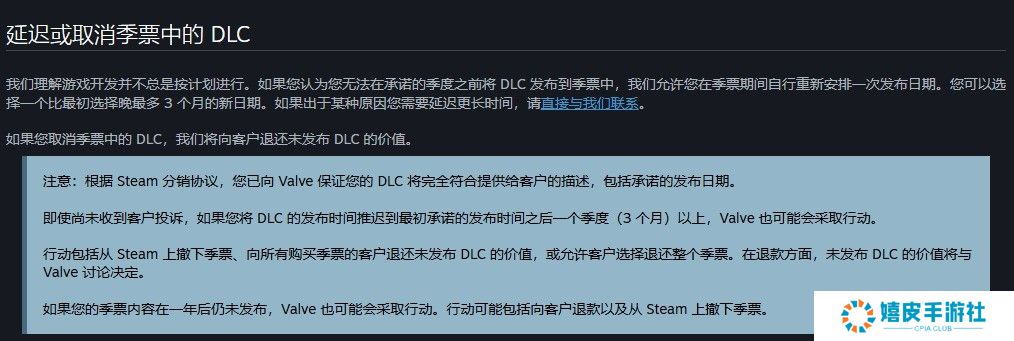 此外,Valve规定游戏季票至少得收录一个已经推出的DLC,不包含在豪华版预购的季票内容。当季票内容因故推迟或取消DLC,开发者和发行商仅一次机会自行重新安排发售日期,但官方规定游戏商选定新发售日时,只能安排在原本日期最多延后三个月的新日期。 如果计划在季票中发行的部分DLC被取消,预购玩家将获得该内容售价金额的退款,官方进一步保障玩家权益:“即使未收到客户投诉,如果某DLC延期超过原定日整整一个季度(3个月),Valve也可能强制采取行动。” Valve的强硬手段包括从Steam下架该季票、向所有购买该季票的玩家退款未发售DLC的金额 ,或允许客户选择退掉整个季票。“关于未发布内容的价值评估,将由Valve与相关方协商决定。”