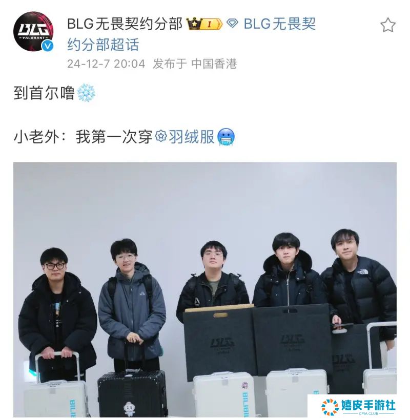 日前,BLG俱乐部晒出了选手抵达韩国合影并配文:到首尔噜!小老外:我第一次穿羽绒服。