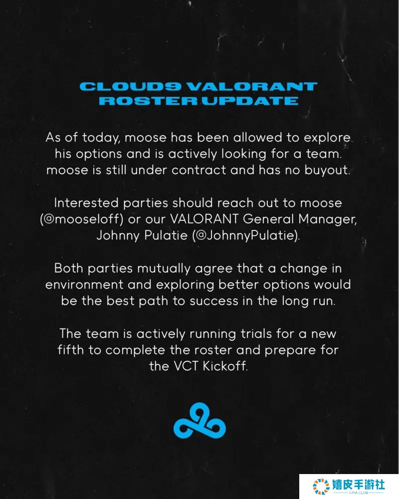 VCT AMER赛区C9战队发布人员变动公告:moose离队成为自由人