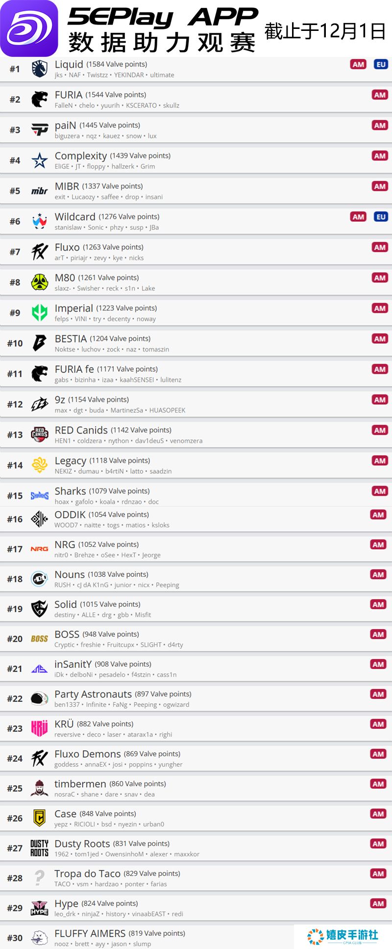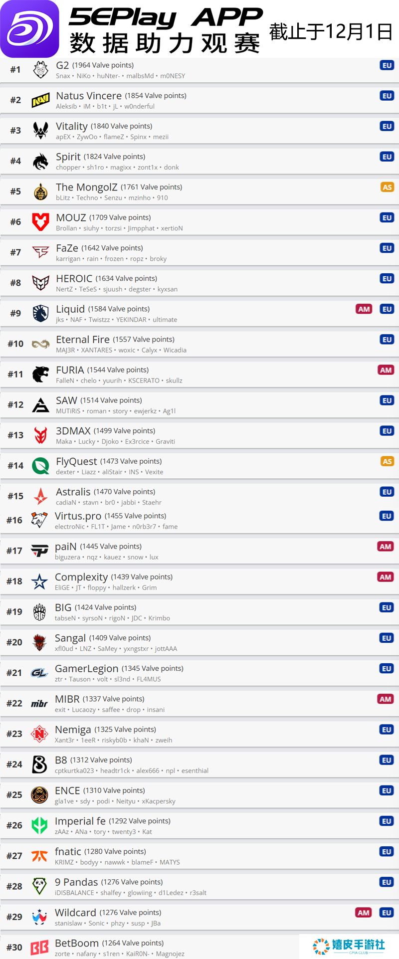 今天V社更新了旗下世界排名。 今天V社更新了旗下CS世界排名,这一世界排名会和明年的赛事邀请紧密联系,因此是主办方和战队都必须关注的内容。 前十名队伍中依旧是欧洲队伍的天下,目前世界排名第一的是 G2战队,紧随其后的是 Natus Vincere,两支队伍分差为110分,第三名是 Vitality战队。前十名中唯一的亚洲战队是排名第五的 The MongolZ。 11-20名位列11的 FURIA对前十虎视眈眈,近来状态不错的 3DMAX和 FlyQuest分别位列13和14名。 21-30名中有不少熟悉的队伍,比如 GamerLegion和 MIBR战队。此外 Wildcard当前位列第29名,他们在美洲RMR中成功打进上海Major。 另外值得注意的是, Imperial女队位列26名,而Imperial男队为39名。 V社世界排名前30如下: