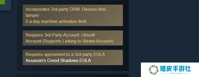 不仅如此,《刺客信条:影》还要求玩家将Steam账户与育碧Connect账号绑定。 此前有人指出,Denuvo加密会影响PC游戏性能,而Denuvo公司却认为该技术不会影响游戏性能,不会对游戏造成负面影响。玩家就是看不到D加密的好。